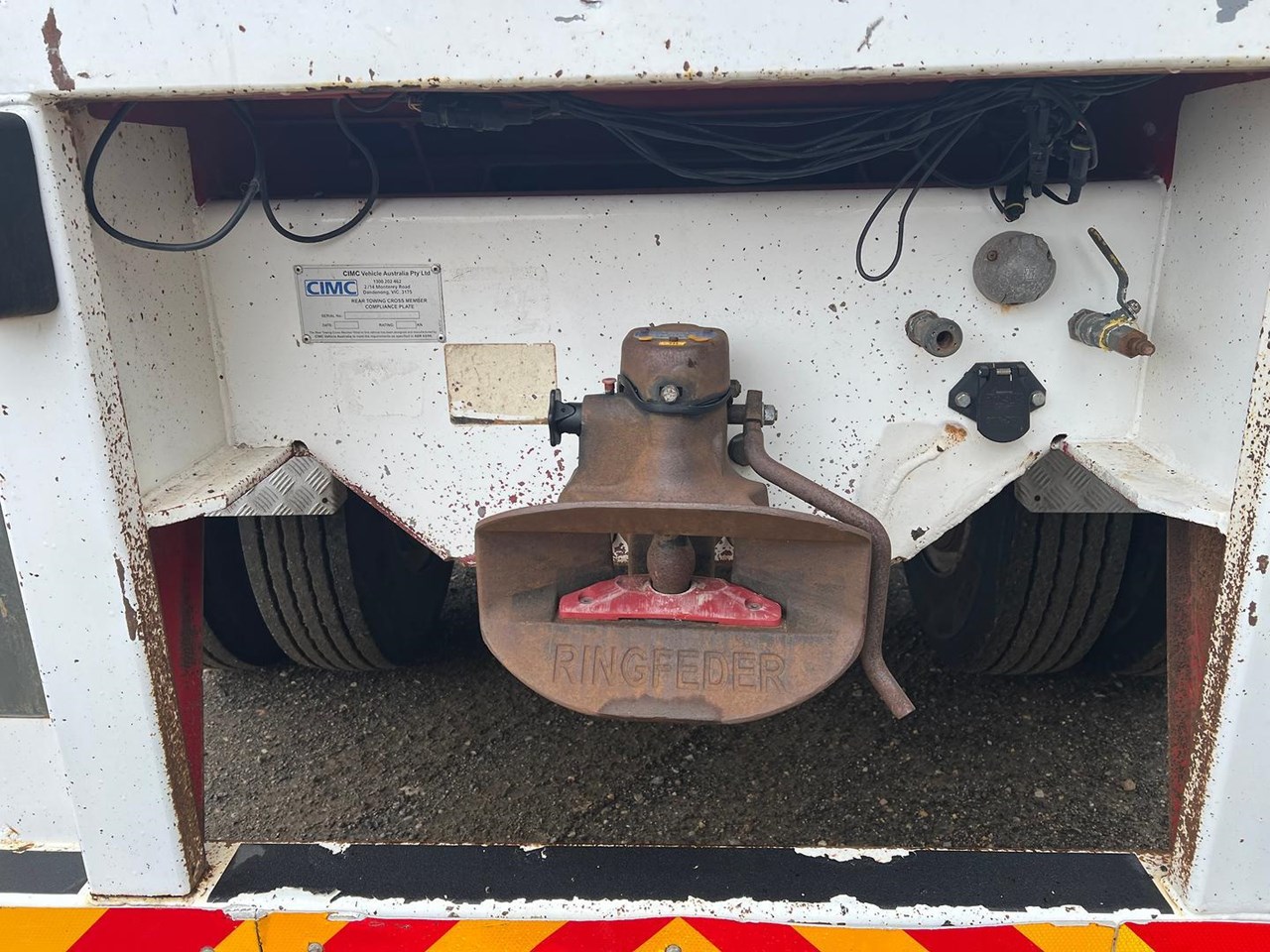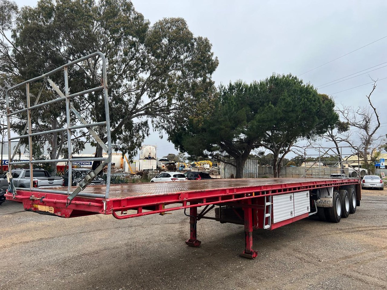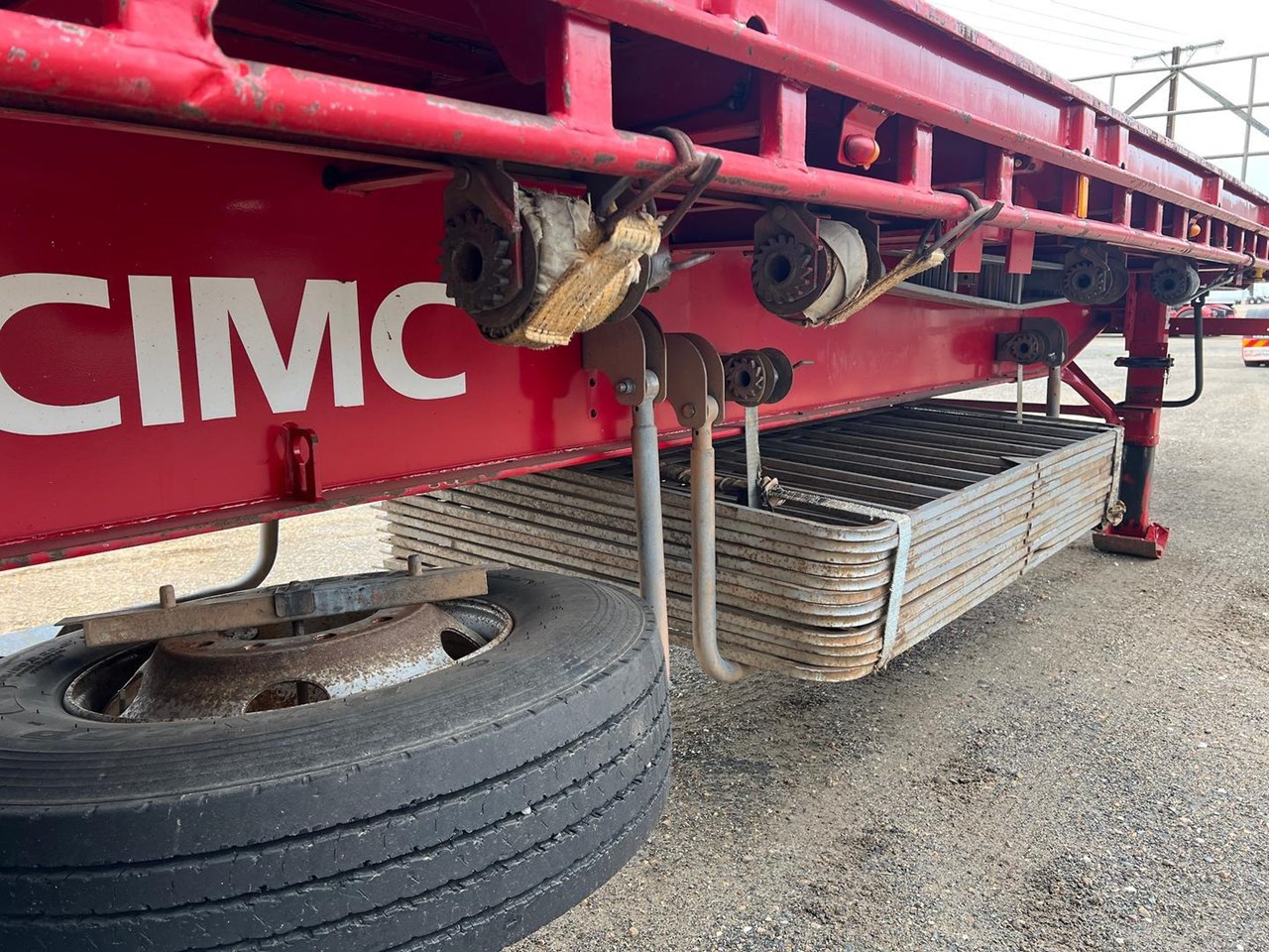 12/2012 CIMC 45" tri axle flat top trailer,KHitch axles on air bag susp,10 stud steel wheels,3 way container pins,Ringfeder fitted in rear with air and electric fittings,Load binders in track,Road Train flip signs,2 x toolboxes on LHS,Water tank,Full set of gates,Spreader bars,Bolt in 2" king pin,Led lights,Spare wheel carrier with spare wheel.