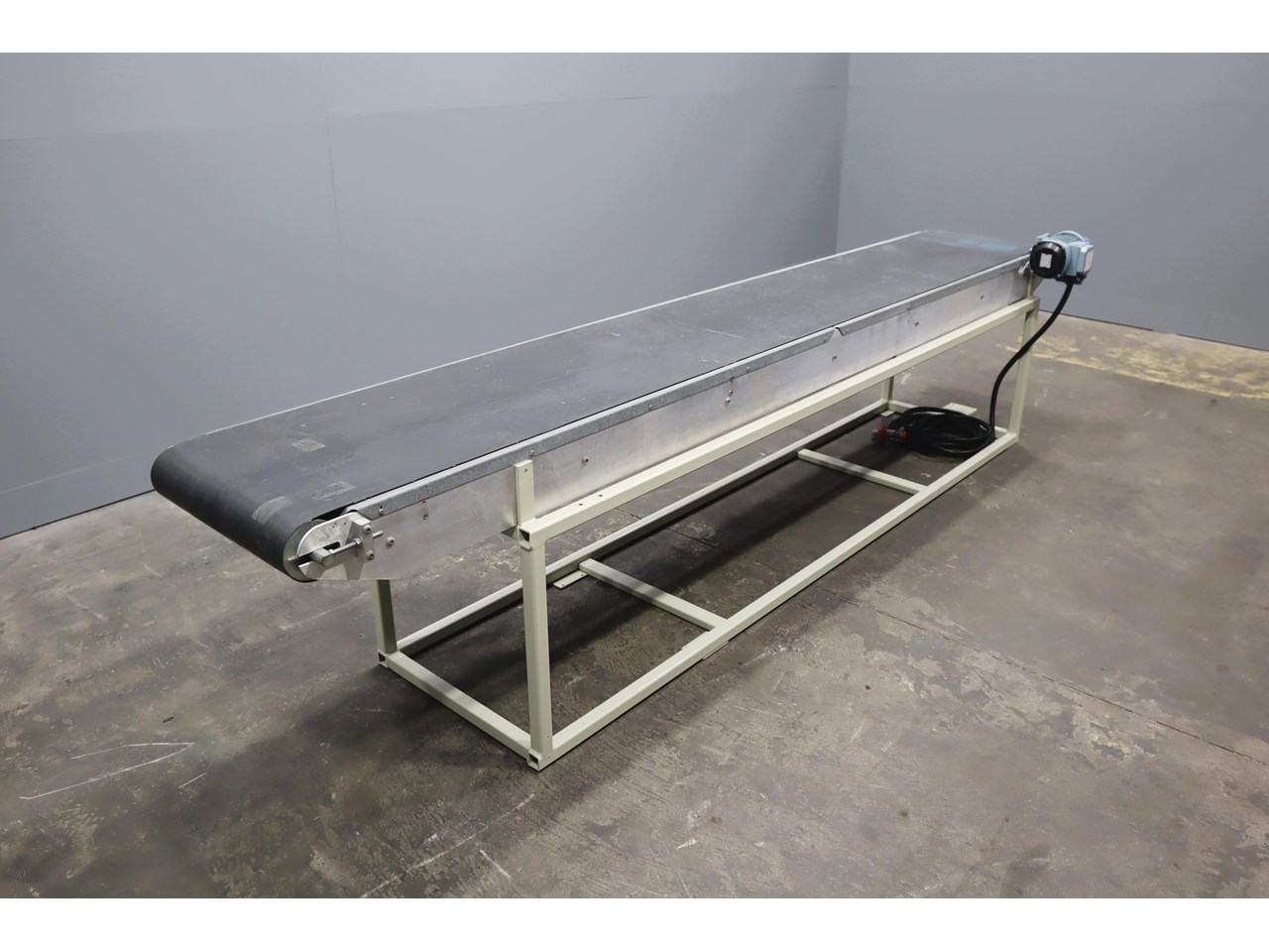 Motorised belt conveyor for general product transfer and handling applications. This conveyor is mounted on a steel support frame. Easy to integrate into existing production lines or use as a standalone conveyor.