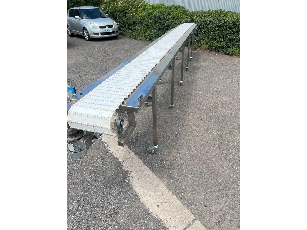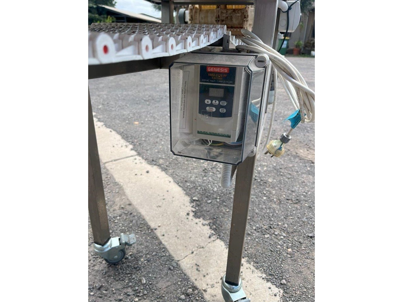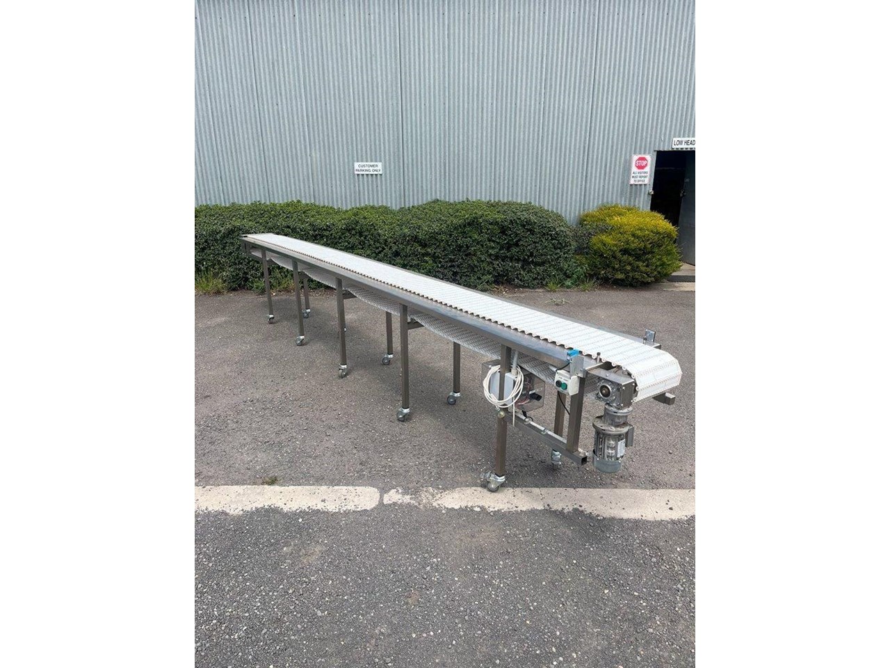 Sanitary Conveyor. Stainless steel construction. Single phase 240V with VSD, Start/Stop and optical sensor. 0.18kW geared motor. Automatic and manual mode. Overall dimensions: Length 5750mm, Width 600mm, Height 920mm Belt dimensions: Length 5500mm, 300mm Wide Conveyor mounted to casters. Belt speed 3.4 metres/min. Unit in excellent condition and runs well.