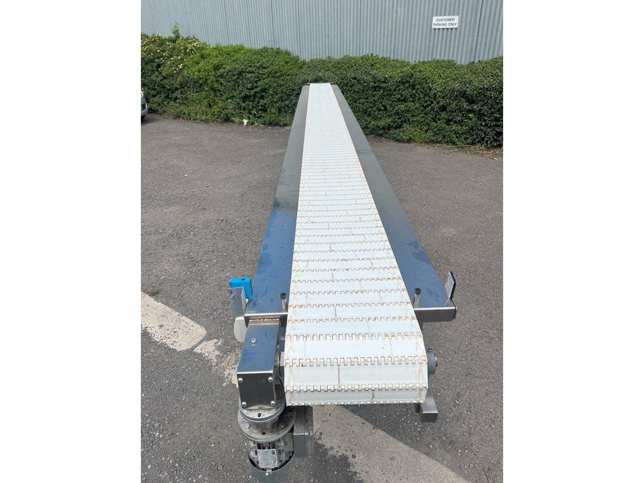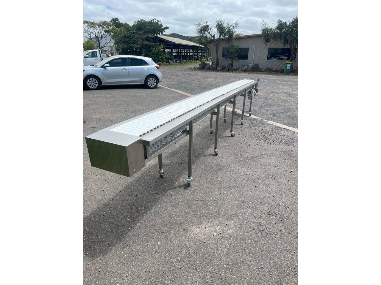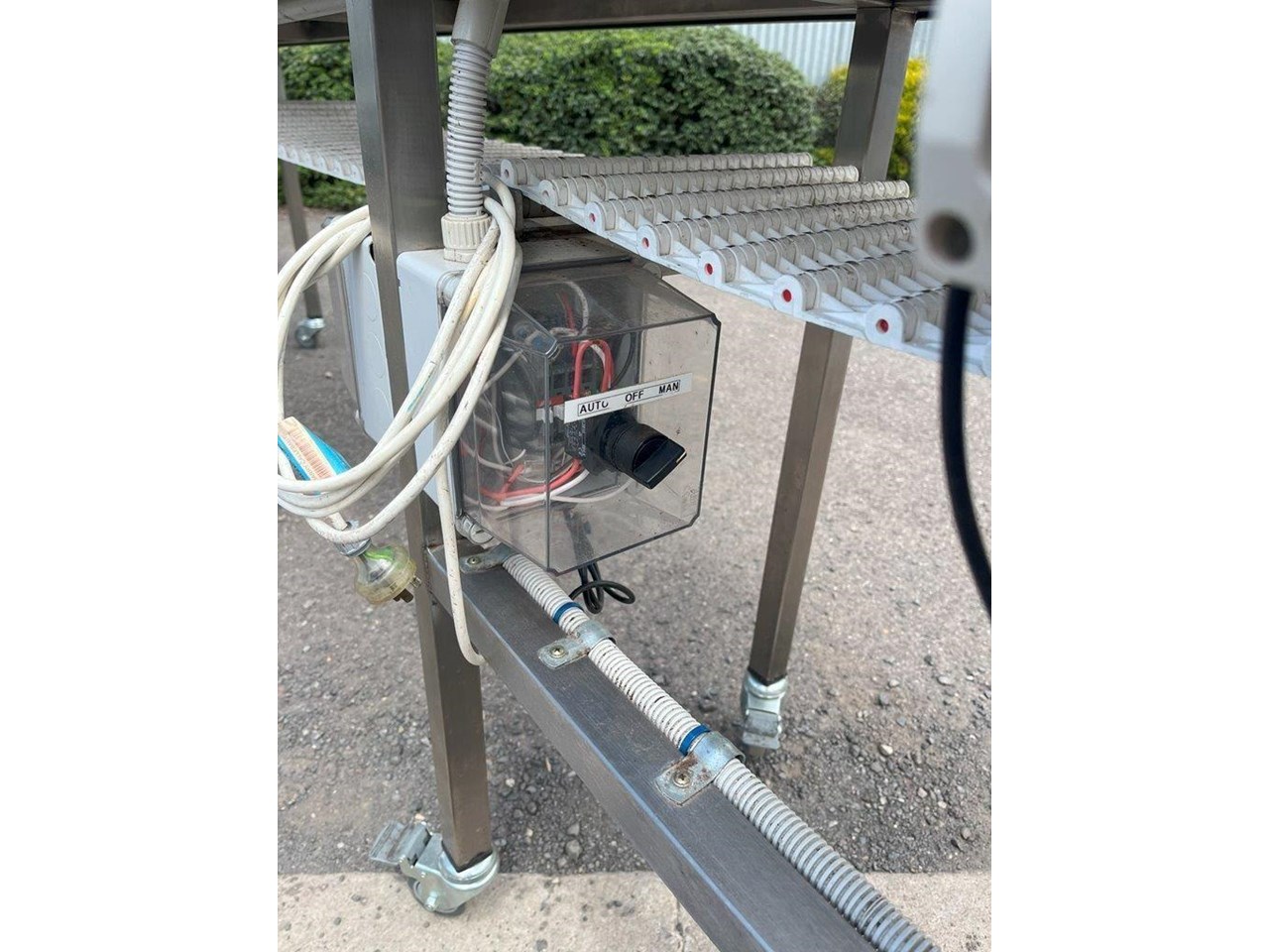 Sanitary Conveyor. Stainless steel construction. Single phase 240V with VSD, Start/Stop and optical sensor. 0.18kW geared motor. Automatic and manual mode. Overall dimensions: Length 5750mm, Width 600mm, Height 920mm Belt dimensions: Length 5500mm, 300mm Wide Conveyor mounted to casters. Belt speed 3.4 metres/min. Unit in excellent condition and runs well.